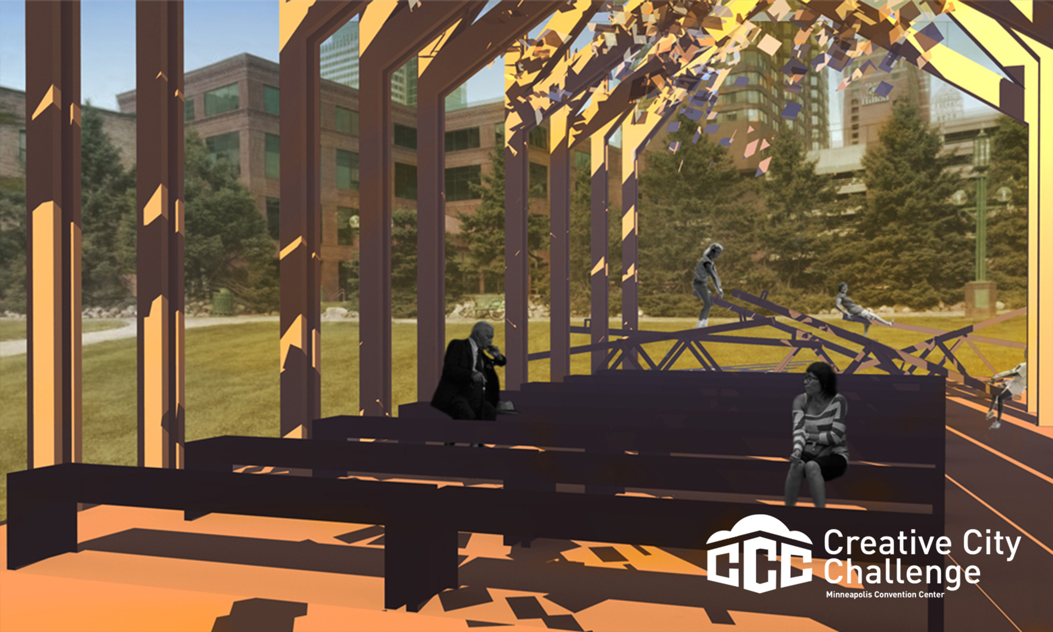 Background information on the Creative City Challenge: The Creative City Challenge (CCC) is a competition for Minnesota-resident architects, landscape architects, urban designers, planners, engineers, scientists, artists, students and individuals of all backgrounds to create and install at the MCC Plaza a temporary, destination artwork. The artwork acts as a sociable and participatory platform for summer-long onsite programming, and encourages a sense of connectedness to the city as a whole and its rich cultural and natural offerings. The MCC Plaza is a green roof that is located directly across from the MCC at 1301 Second Avenue South.