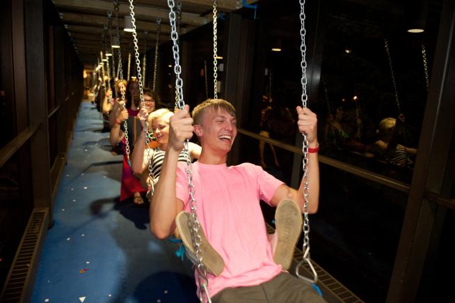 Back due to popular demand, Keetra Dean Dixon’s collective, high in the sky, swing installation in the skywalk on the MCAD campus makes the solitary sensation of swinging take on a new dimension. For a full, even swing, all swingers must be in sync. Out of pace swinging results in playful collision.
