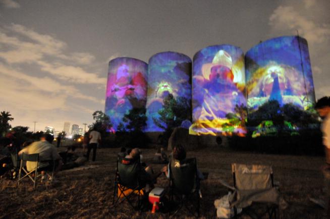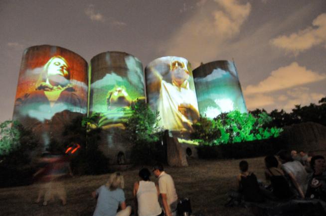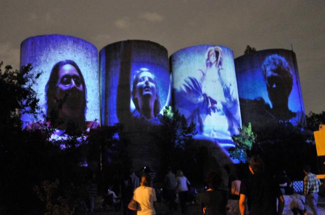 A giant light sculpture, an interactive media piece, and a multilayered architectural projection montage all in one, Luke Savisky’s E/x MN puts you into the artwork on a monumental scale. Within pulsing layers of color and motion imagery, audience members become participants in a live projection event as their projected faces and bodies move through and interact with the shapes of the enormous silos of the Gold Medal flour mill. An interactive kiosk encourages participants to be transformed into larger than life characters in an exploration of spatial and personal relationships, confinement, public representation, self-perception, emergence, and transformation, while a projection montage over the entire structure moves the viewer into another dimension. Accompanied by a soundscape composed by Savisky’s long-time collaborators ambient masters Adam Wiltzie and Brian McBride of Stars of the Lid, the resulting experience will create a haunting, otherworldly scene against the Minneapolis skyline.