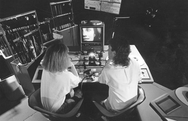 Students editing a film at MCAD, 1988. Photo by Layne Kennedy, MCAD archives.